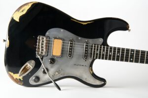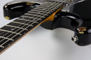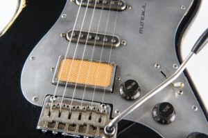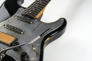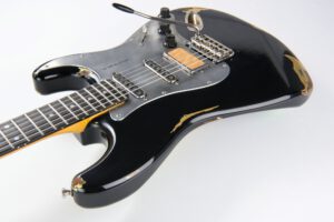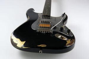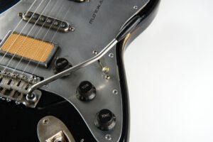 Aus unserer „Gold Rush“ Reihe zeigt sich unsere Salinger Fortissimo im Dark-Cover-Design. In echter Player Manier blitzt das satte goldfarbene Finish unter der tiefschwarzen Overlackierung hervor und adelt unsere moews Salinger. Als stilvoller Hingucker krönt der leuchtende Swarovski Kristall den tropfenförmigen Tip-Schalter, während das Aluminium Pickguard im matt-gebürsteten Industrial-Style den Glamour-Status aufbricht.